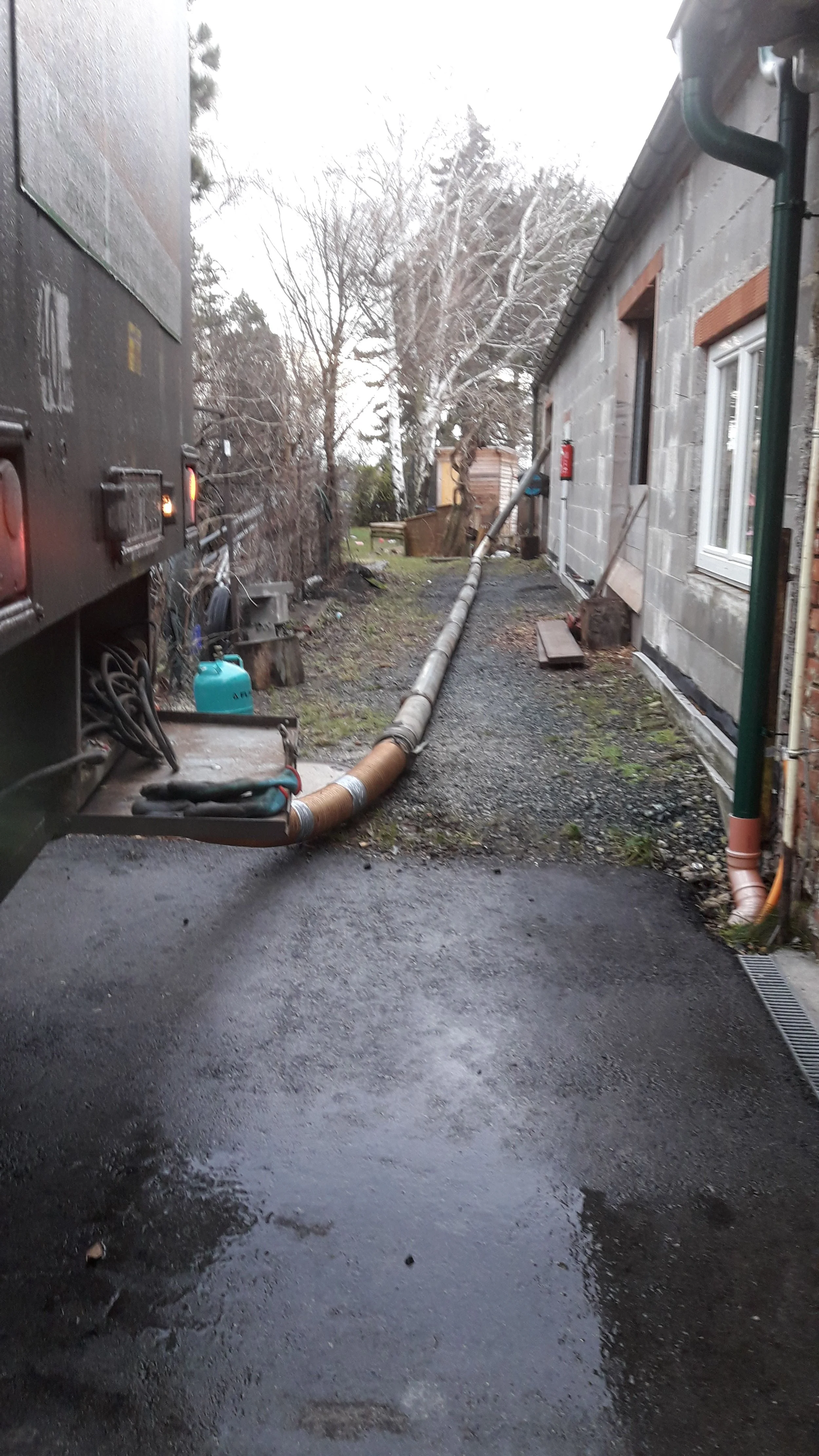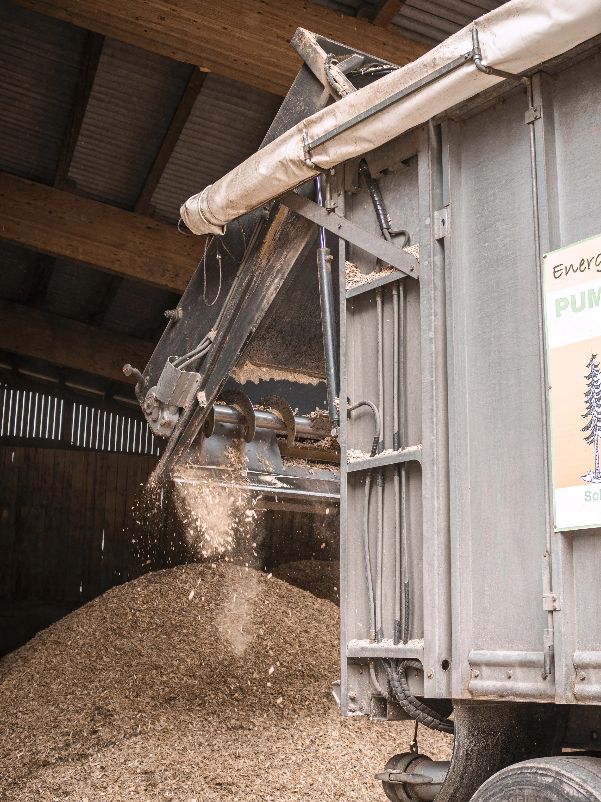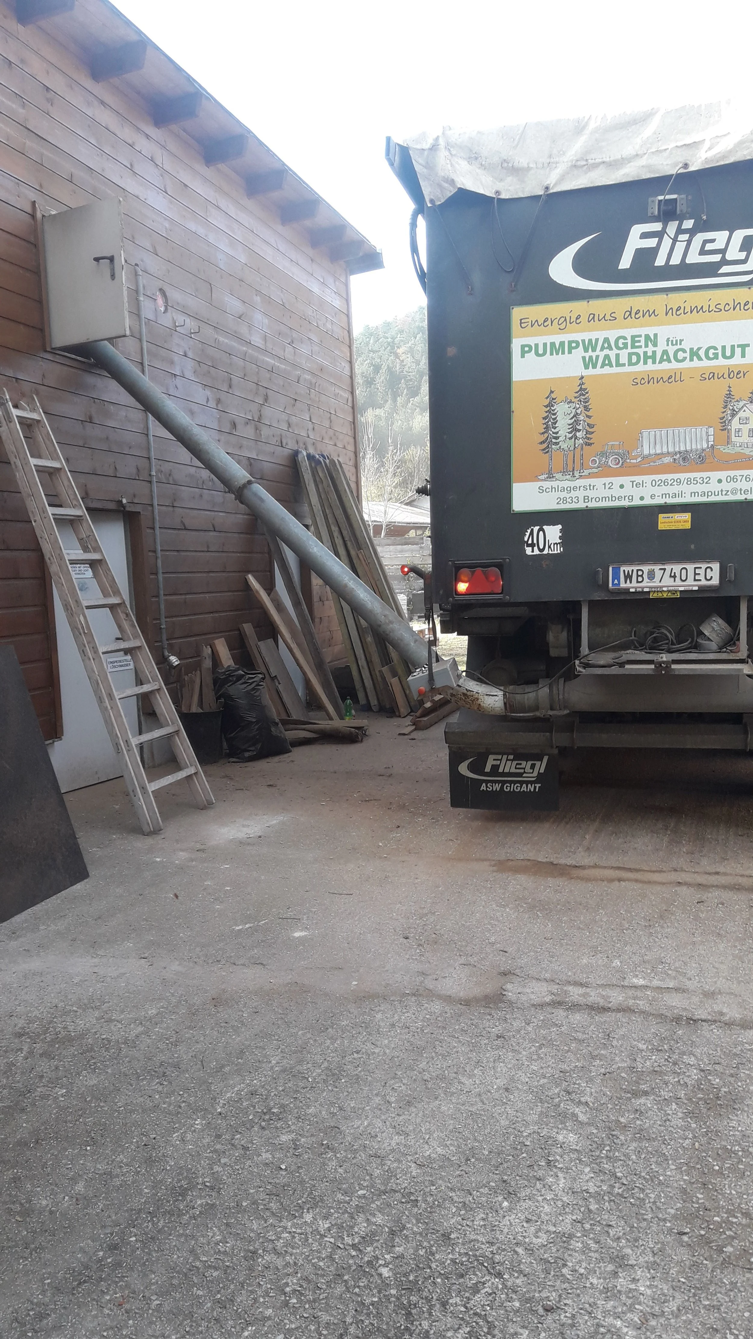 Unser Hackgut wird mithilfe eines Pumpwagens eingeblasen. Dabei ist es möglich nahezu staubfrei zu arbeiten, da das Hackgut über Rohre direkt vom Pumpwagen in den Bunker gefördert wird. Standardmäßiges Abkippen bzw. Abschieben ist natürlich weiterhin möglich.